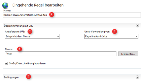 - Hier wird das Muster für den URL-Pfad festgelegt. Das Symbol "^" definiert den Anfang des Musters, "ecp/" muss somit unmittelbar nach dem Host folgen. myserver/ecp/ trifft zu; myserver/abc/ecp dagegen nicht.