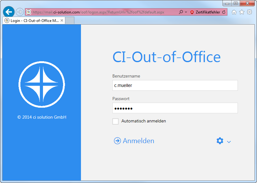 Rufen Sie jetzt die Funktion "Automatische Antworten" aus OWA auf. Wenn Sie alles richtig gemacht haben, werden Sie wie von Zauberhand auf das CI-Out-of-Office Web-Interface weitergeleitet...