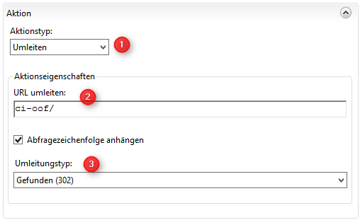 - Aktionstyp ist "umleiten", denn der Anwender soll auf diese neue URL umgeleitet werden.